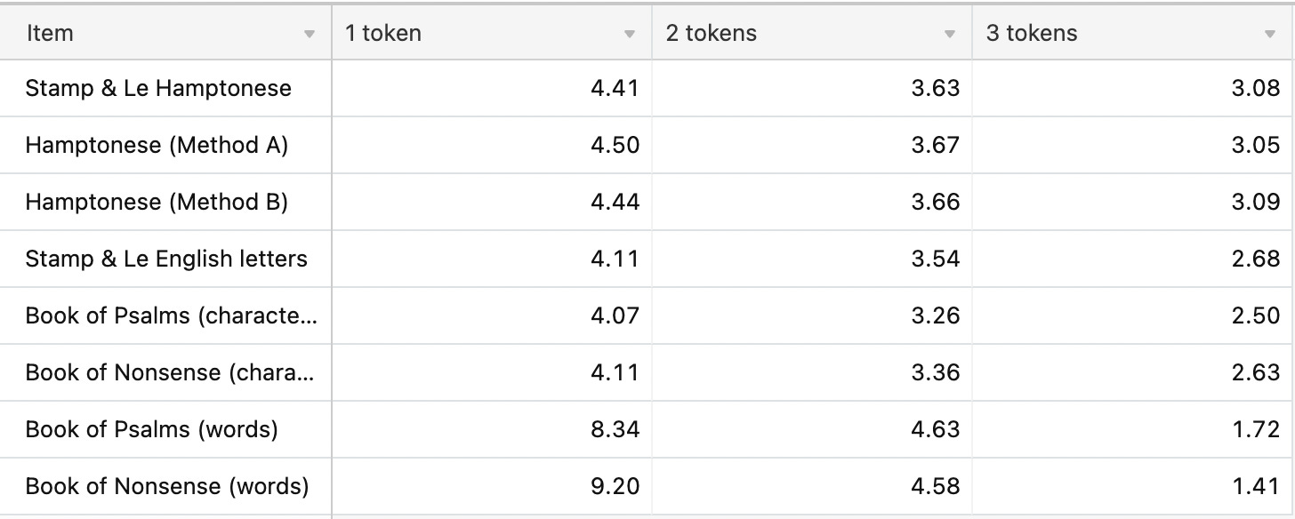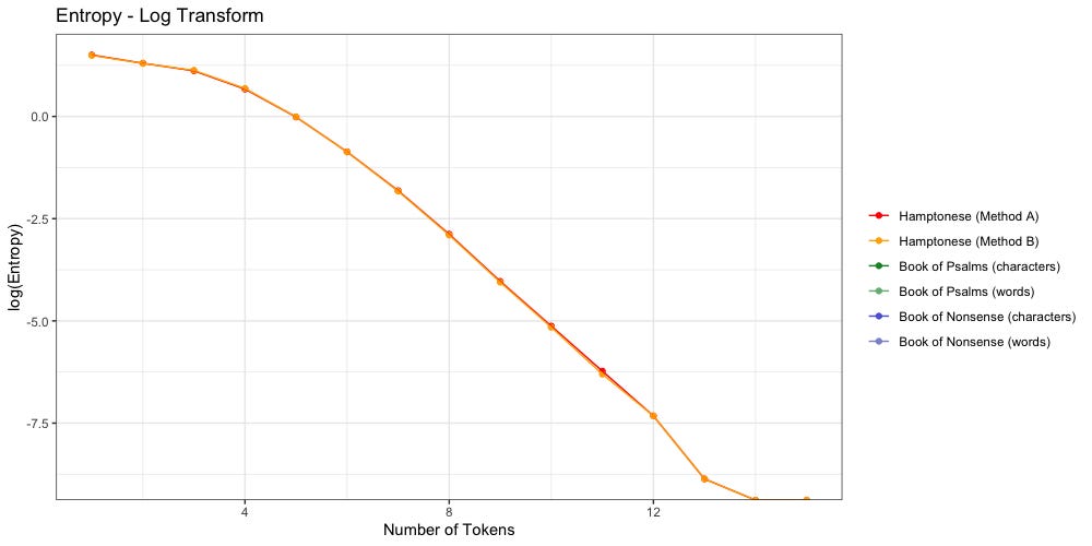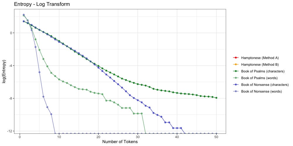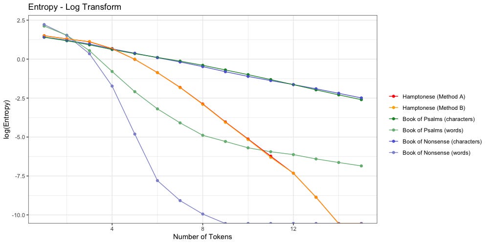 Method A still “feels more right” to me, but for the sake of this entropy analysis, it didn’t make any noticeable difference. Method A and Method B agree: Hamptonese runs out of entropy after 13 characters.