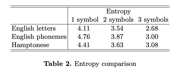 The results in Table 2 indicate that for strings of three symbols or less, the information contained in Hamptonese is comparable to that of English. Of course, this does not prove that Hamptonese is a language, but it does suggest that it is reasonable to pursue the analysis further. [emphasis added]
