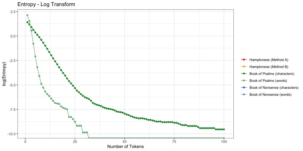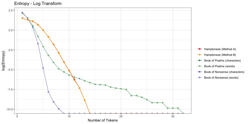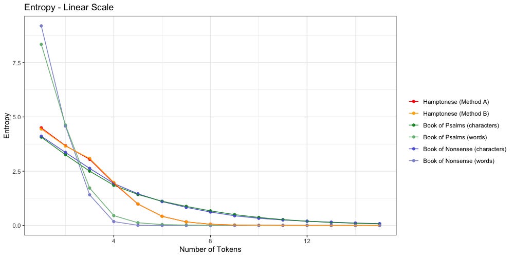 The above plot confirms Stamp’s findings: Hamptonese is not a simple substitution for English. Change in Hamptonese entropy (orange/red) looks nothing like the change in character entropy (dark blue, dark green) found in both “Nonsense” or “Psalms”. It is possible that Hamptonese would better match the character distribution of another language.