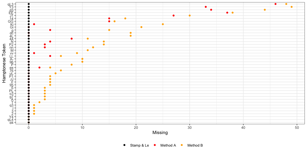 Compared to Stamp’s frequency table, we find Method A is missing a total of 237 tokens, but also includes 256 tokens omitted by Stamp. In comparison, Method B is missing 499 tokens (ignoring uncertain items). This is out of a total corpus of roughly 29,000 tokens (~1.7%).