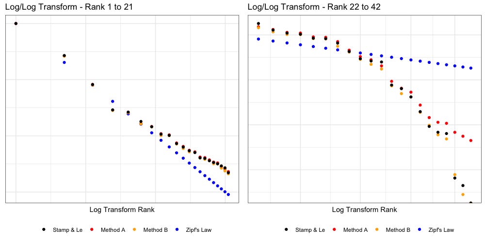 Hamptonese appears to be fairly Zipfian, but only if we restrict our view to the 32 most common tokens. Past that, everything falls apart. We also find that as we approach rarer tokens (left to right) our own Method A and Method B disagree more, with both Stamp and each other.