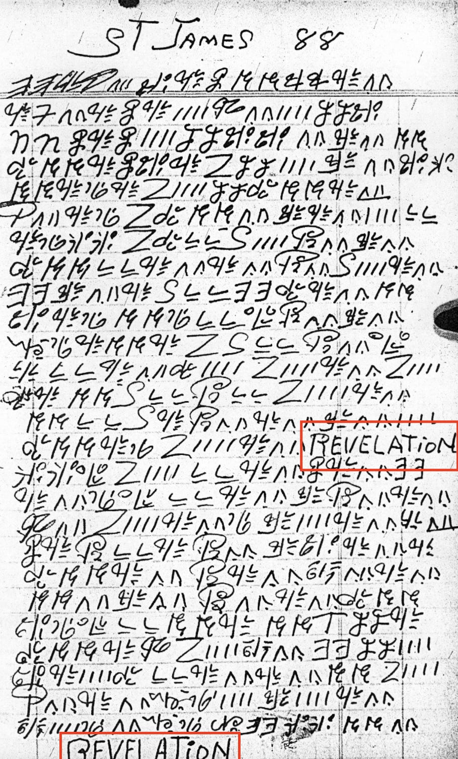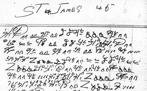 Hampton also left behind a notebook filled with more than 100 pages written in a mysterious script. This script has been dubbed “Hamptonese”. A partial page is pictured below.