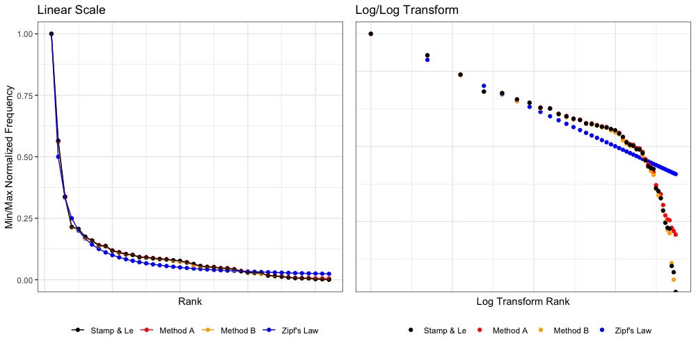 Below we have plotted Zipf’s Law (blue, 1/n, “untuned”) against the data according to Stamp’s paper and our own Method A and Method B.